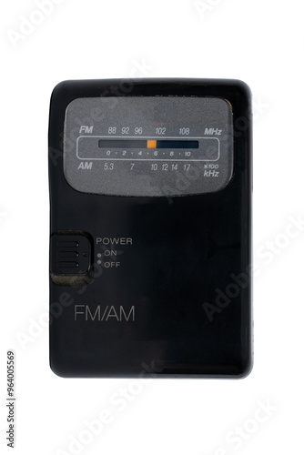 © Uri, Fototapeta premium Old small FM AM radio black isolated on white background. Vintage.