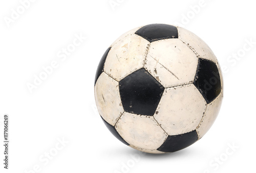© Panupong, Obraz premium Old Soccer ball with wear and tear from play. Classic black and white football isolated on white background with shadow.