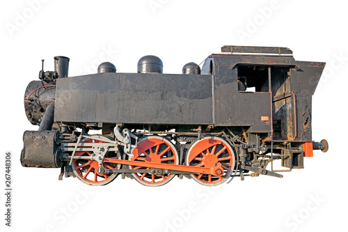 Naklejka premium Old steam locomotive, vintage train isolated on white