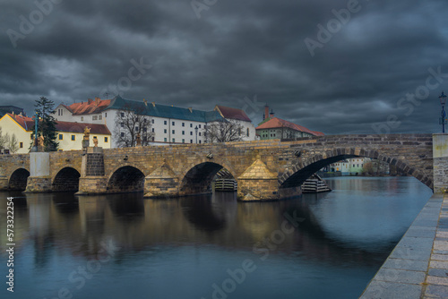 © luzkovyvagon.cz, Fototapeta premium Old stone bridge and center of Pisek town in cloudy winter morning
