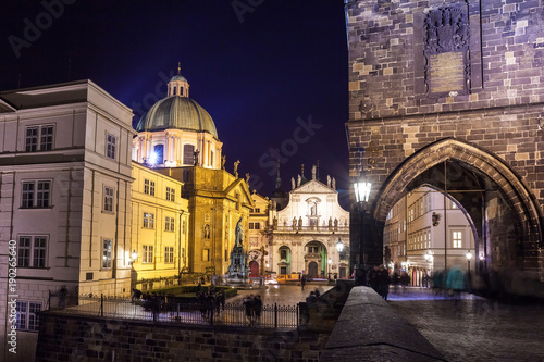 © k_samurkas, Obraz premium old stone bridge Charles Prague medieval landmark night travel