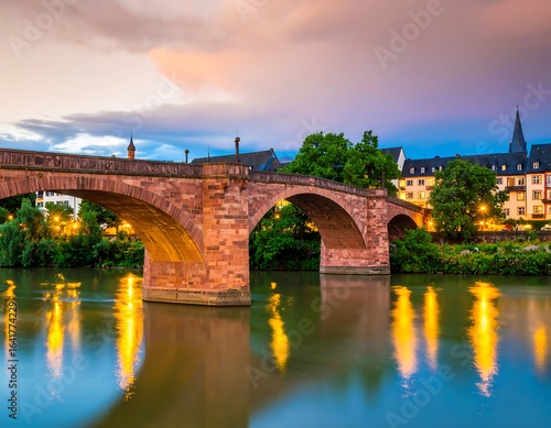 © Rejeki, Fototapeta premium Old stone bridge over river at sunset