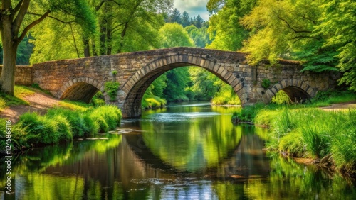 © Nasnunt, Fototapeta premium Old stone bridge with a winding river and lush greenery, rustic, river, rustic, river, bridge