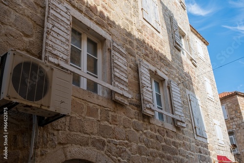 Fototapeta premium Old stone building with weathered shutters and AC unit
