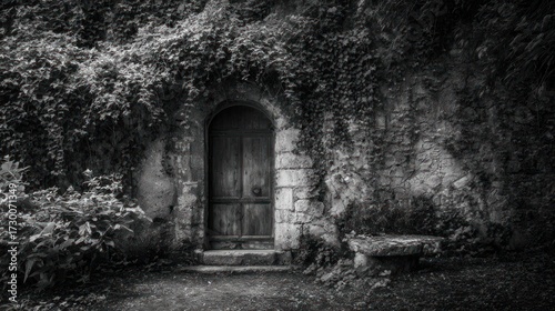 Fototapeta premium Old stone door in lush foliage, leading to unknown space. Monochromatic,...