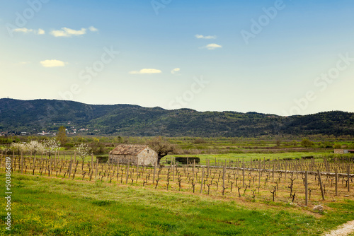 Fototapeta premium Old stone farm barn in spring vineyard. Europe.