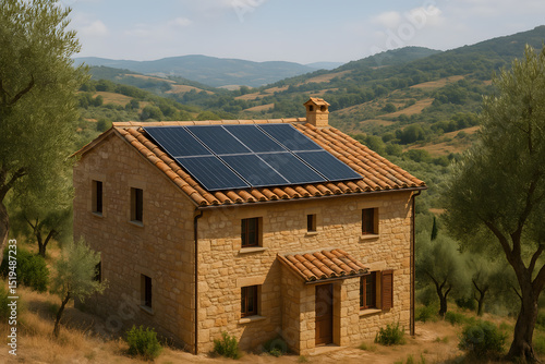 Obraz premium Old Stone House in Mediterranean Hills With Rooftop Solar