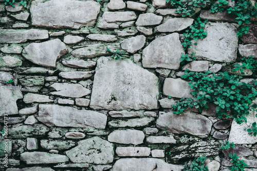 Obraz premium Old stone wall consisting of white stacked stones surrounded by vines,...