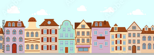 Fototapeta premium Old street European. seamless pattern town. Small town with retro houses.