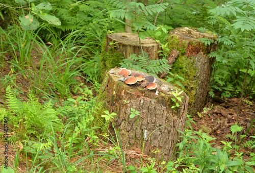 © konstan, Obraz premium Old stump covered with mushrooms.