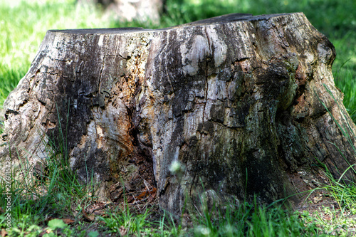 © Dmitry, Obraz premium Old stump in the forest on a background of green grass.
