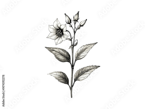 Fototapeta premium Old style engraving bellflower sketch, hand-drawn botanical flower illustration, vintage decor motif, antique stem print, retro floral art, classic wildflower etching, black line art