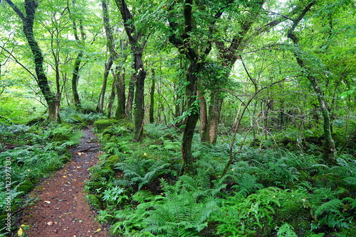 © SooHyun, Fototapeta premium old summer path through mossy rocks and old trees