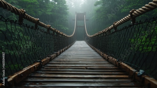 © Nataliya, Obraz premium old suspension bridge on ropes in fog