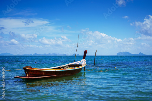 Naklejka premium Old Thai wooden boats. Traditional tropical seascape. Traditional wooden longtail taxi boat. Fishing boat docked off the coast of the blue sea.