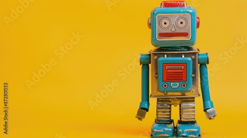Fototapeta premium Old tin robot toy on yellow background