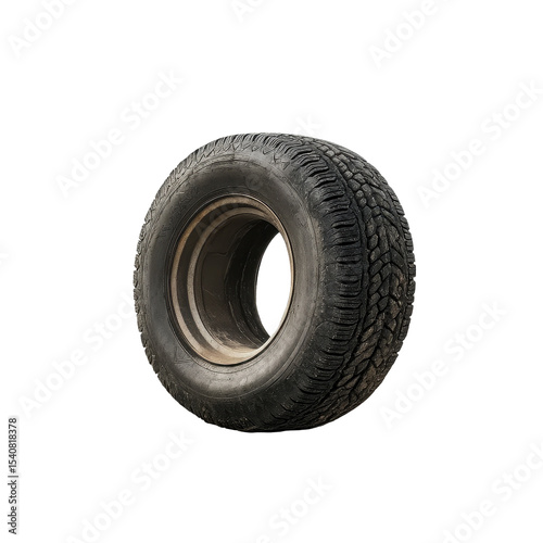 © Ifti Digital, Naklejka premium Old tire rests along a dusty dirt road under a clear white sky, tire sitting on the side a dirt road, Transparent background
