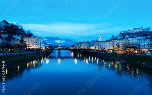 Naklejka premium Old town and Hohensalzburg castle at Salzach River Salzburg evening