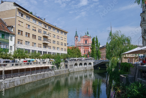 Naklejka premium Old town embankment in Ljubljana with the franciscan church of annunciation....