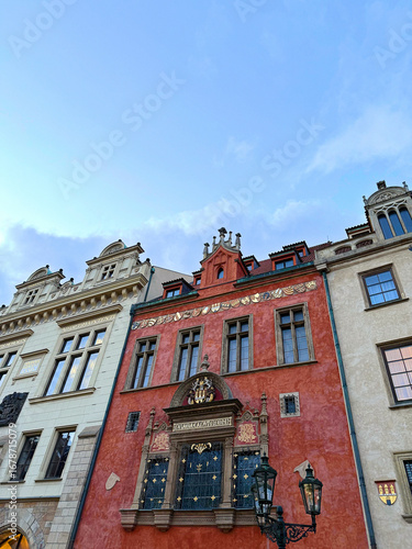 © artmim, Fototapeta premium Old Town Hall West house facade with Praga Caput Regni inscription (Prague Head of the Kingdom) and Coat of Arms at Old Town Square, Prague, Czech Republic