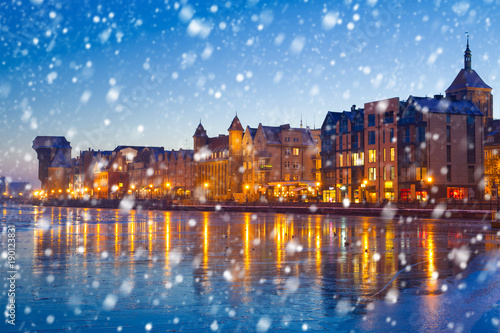 Obraz premium Old town of Gdansk on a cold winter night with falling snow, Poland