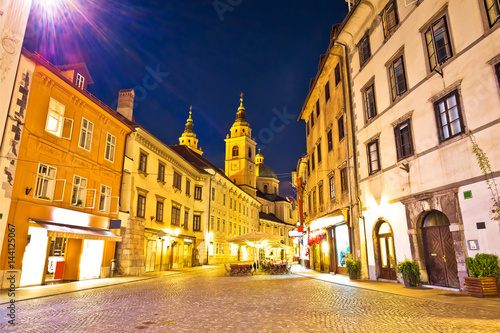 Naklejka premium Old town of Ljubljana colorful street and architecture evening view
