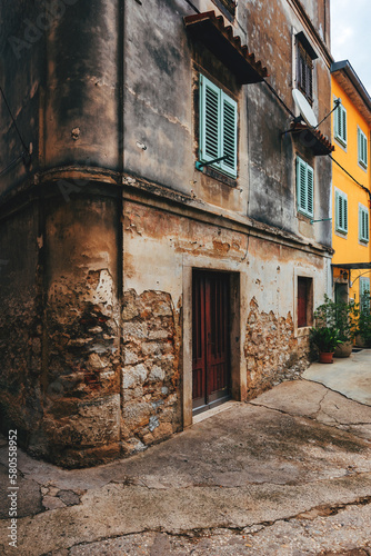 Naklejka premium Old town of Lovran in Croatia, distinctive Istrian architecture with worn facades and wooden window shutters