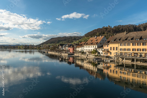 Obraz premium Old town with waterfront promenade and Hohenklingen Castle, Stein am Rhein,...
