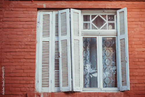© allasimacheva, Fototapeta premium Old traditional wooden window captured in Korca, a small town situated in south east of Albania.