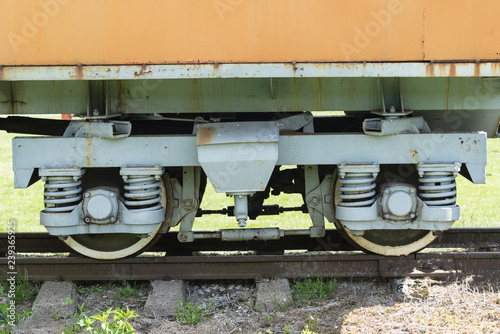 Naklejka premium Old train and locomotive wheels. Railroad tracks stretches and green grass and trees. Railway road environment background.