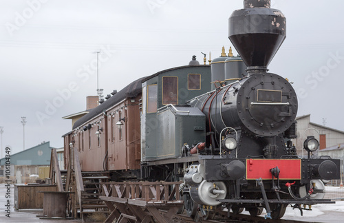 © nadezhdaabramian, Naklejka premium Old train carriage in Finland. Restaurant in the train in this old wagon, winter landscape.