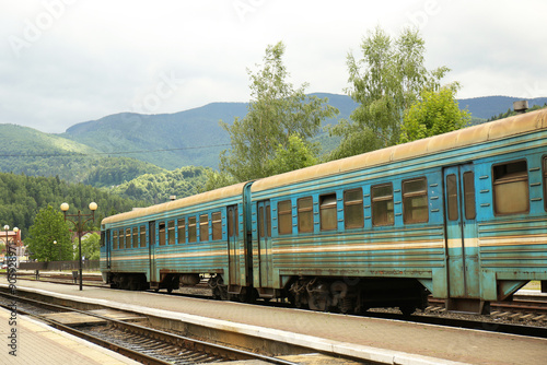 Obraz premium Old train on railway station in mountains