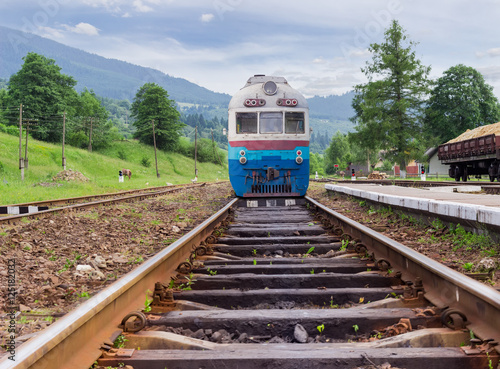 © An-T, Fototapeta premium Old train on the railroad tracks on railway station in Carpathians