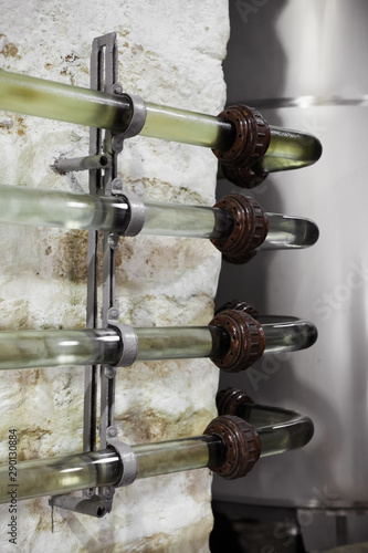 Fototapeta premium Old transparent glass pipeline system for wine