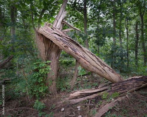 Fototapeta premium Old tree collapsed due to rot and decay on the forest floor