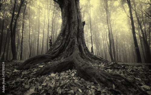 Fototapeta premium old tree roots in dark forest, ground level perspective landscape