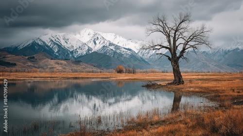Fototapeta premium Old tree stands at the edge of a lake with snowcapped mountains in the...