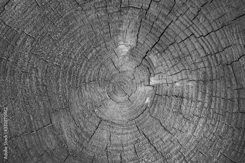 © Aleksei, Fototapeta premium Old tree stump black and white texture background. Tree stump closeup view texture. BW tree sump texture photo.