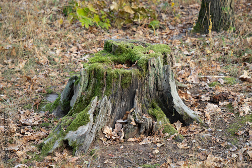 Fototapeta premium Old tree stump covered with moss in the deciduous forest.