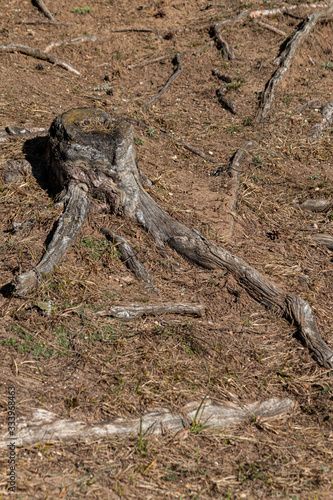 © Zigmar Stein, Obraz premium Old tree stump with roots on a spring day
