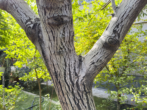 © Karen Vardanian, Obraz premium Old tree, tree with thick branches, white tree. A tree trunk with a few holes in it. The trunk is brown and has a few white spots