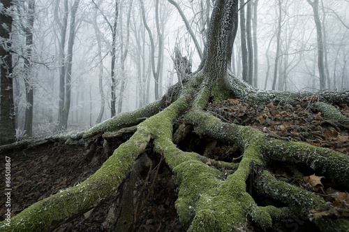 © andreiuc88, Fototapeta premium old tree with big roots in misty forest