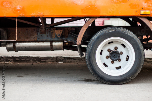 © Nikita Khrebtov, Naklejka premium Old truck's rear wheel and old rusty parts hiden under new painted body