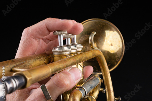 © Piotr, Obraz premium Old trumpet on a dark wooden table. Wind instrument in the old style.
