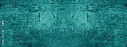 Fototapeta premium Old turquoise green vintage worn shabby patchwork motif tiles stone concrete cement wall texture background banner