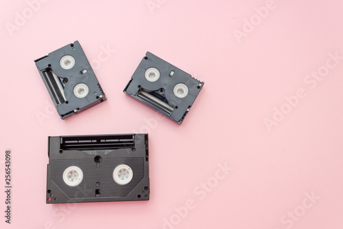 Fototapeta premium Old VHS videotapes, retro concept. Video cassette on a pink background