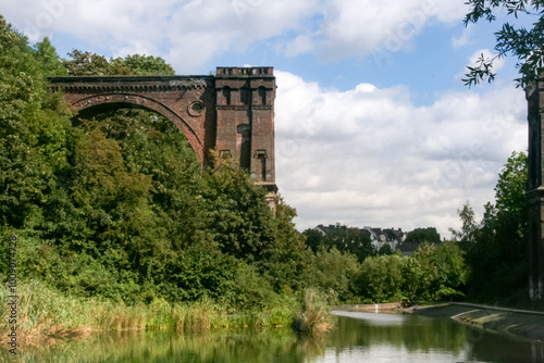 © Anna, Fototapeta premium Old viaduct bridge covered with green trees and bushes next to a pond.