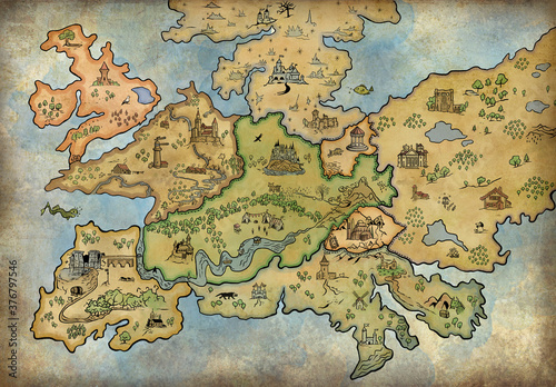 © Domingo, Naklejka premium Old vintage map of a peninsula with handmade drawings for treasure games and fantasy stories with land and sea