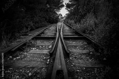 © CoinUp, Naklejka premium Old vintage railway tracks in black and white