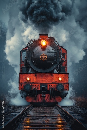 © Lubos Chlubny, Obraz premium Old vintage steam locomotive is approaching on railway in dramatic scenery